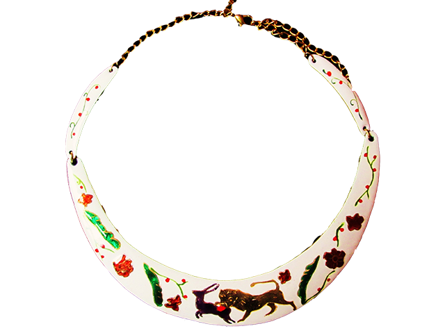 Collier blanc 160, fleurs et feuillages enluminées peintures à vitrifier, chaîne, anneaux et fermoir argent 925