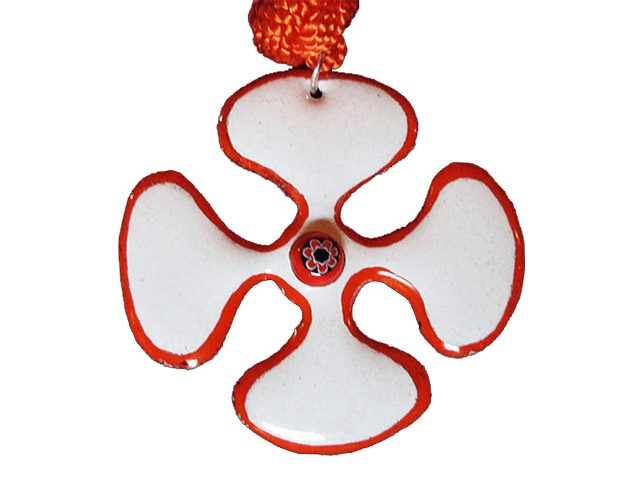 Fleur émail blanc 160, pourtour peinture à vitrifier orange, fleur d’émail au centre, anneau argent 925, cordon de soie réglable orange