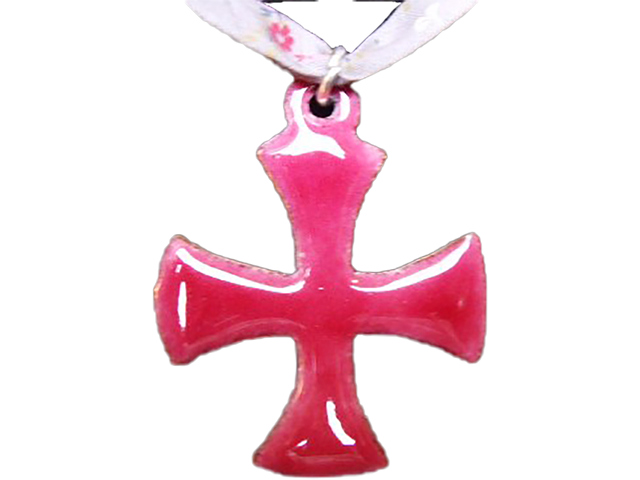 Croix pattée 4 x 4,5 cm, émail rouge 41 sur blanc 160 et opale 101, anneau argent 925, ruban liberty rose/gris à nouer