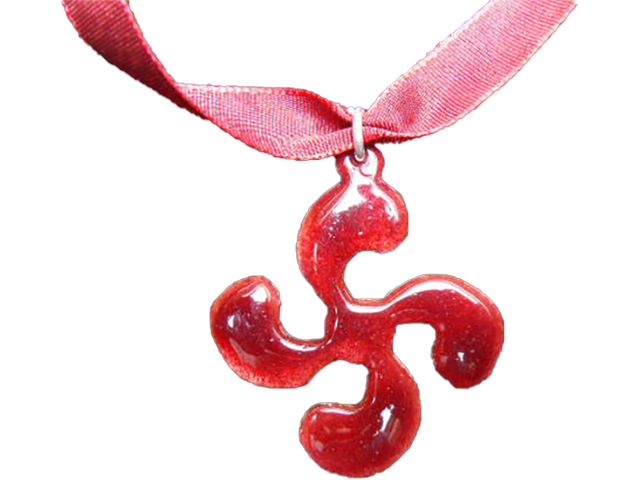 Croix basque 4 x 4 cm, émail rouge 40 sur fondant 1, anneau plaqué or, ruban plat rouge à nouer