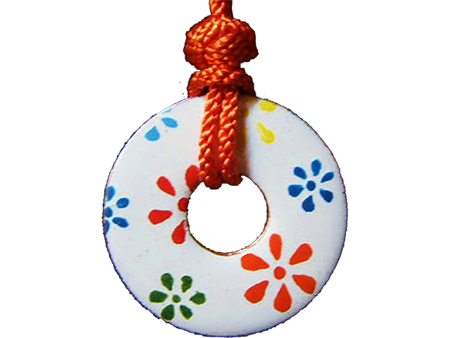 Médaillon ajouré Ø 4 cm, trou centré Ø 2 cm, émail blanc 161, fleurs peintures à vitrifier, cordon de soie réglable orange