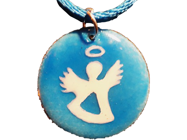 Médaillon Ø 2,5 cm, émail bleu 251 sur blanc 160 et opale 101, fondant 2, ange peinture à vitrifier blanche, anneau argent 925, cordon simple de coton bleu à nouer