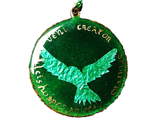 Médaillon Ø 4 cm, émail vert 49 sur fondant 1, colombe paillon d’argent, écriture à l’or, anneau plaqué or, cordon de soie réglable vert