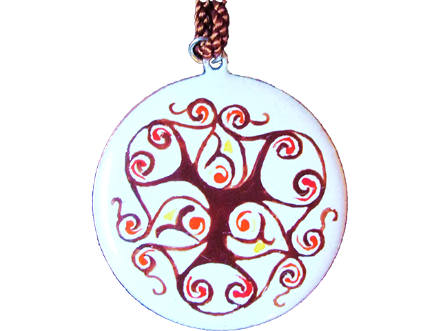 Médaillon Ø 4 cm, émail blanc 160 sur fondant 1, fondant 2, peintures à vitrifier marron, jaune et orange, anneau argent 925, cordon de soie réglable marron