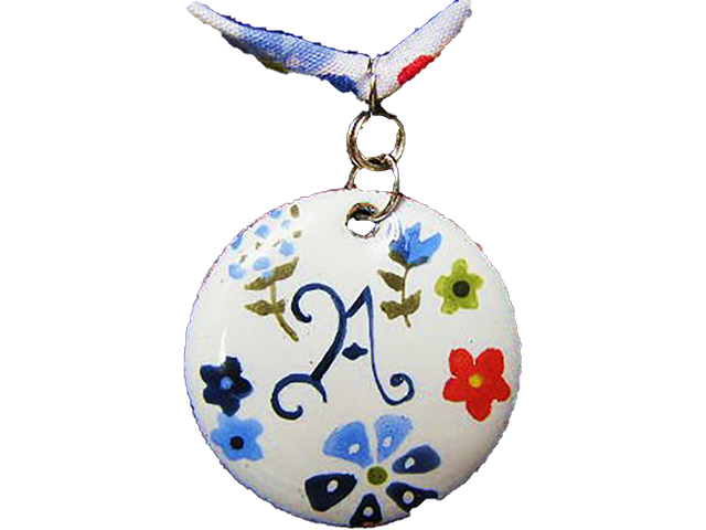 Médaillon Ø 2,8 cm, émail blanc 161, fleurs identiques au ruban et initiale peintures à vitrifier, anneaux argent 925, ruban liberty à nouer