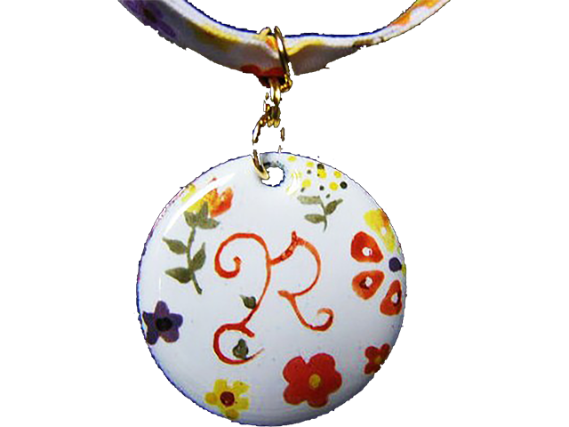 Médaillon Ø 2,8 cm, émail blanc 161, fleurs identiques au ruban et initiale peintures à vitrifier, anneaux argent 925, ruban liberty à nouer