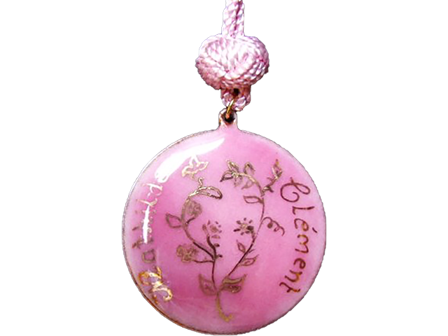 Médaillon Ø 4 cm, émail rose 1943 sur blanc 160 et opale 101, feuillage et écritures à l’or, anneau plaqué or, cordon de soie réglable rose