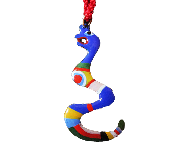 Serpent 2,7 x 5,3 cm, émail opaque bleu 195, motifs peintures à vitrifier, anneau argent 925, cordon de soie réglable rouge vif