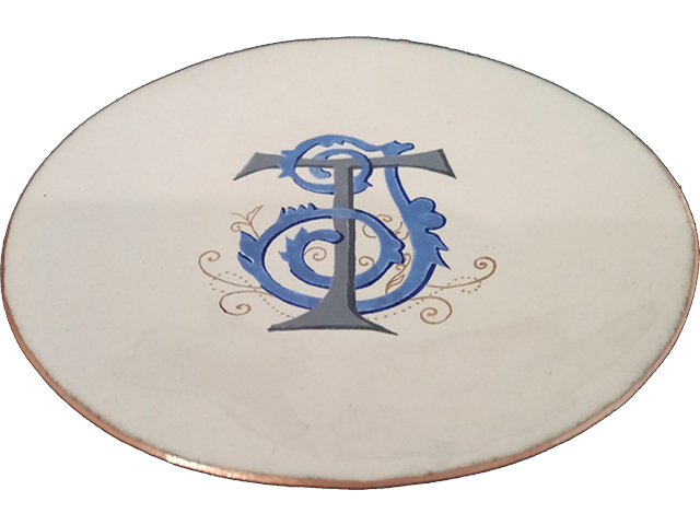 Coupelle ronde Ø13,8 cm, émail blanc teinté 98 sur fondant 1, fondant 2, peintures à vitrifier bleue et grise pour lettres entrelacées T et J enluminées à l’or