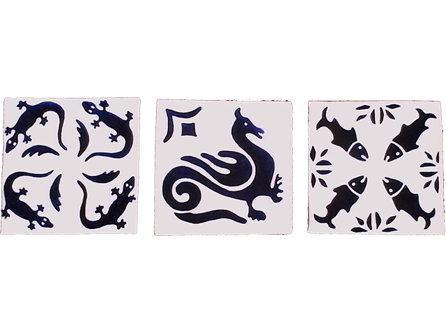 3 grands carreaux médiévaux 8 x 8 cm, émail blanc 160 sur fondant 1, fondant 2, motifs pavage médiéval peinture à vitrifier bleu pétrole