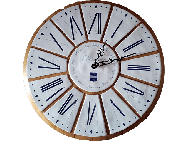 Horloge sur couvercle de fût en chêne massif Ø59cm, 12 plaques en émail blanc 160 sur fondant 2 avec chiffres romains en peinture à vitrifier bleu-gris Degussa et gris clair, mécanisme à piles, aiguilles métal noir.