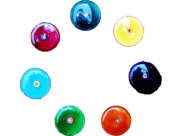 7 magnets, Ø 2,8 cm, émaux jaune 16, bleu 184, vert 51, vert 1572, orange 38, violet-bleu 1586 sur blanc 160 et opale 101, fleurs d’émail