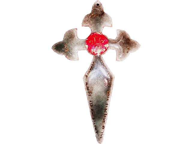 Croix de Saint Jacques percée 14,5 x 9 cm, émail gris 604 et 602 sur blanc 160 et opale 101, émail framboise K sur paillon d’or au centre, écriture à l’or