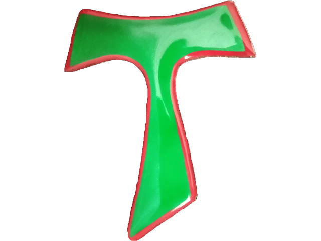 Croix de Saint Antoine (Tau de St François) 13 x 12,5 cm, émail vert 250 sur blanc 160 et opale 101, peinture à vitrifier rouge, écriture or au dos