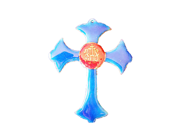 Croix festonnée percée 11 x 9 cm, émail bleu 241 sur blanc 160 et opale 101, émail framboise K sur paillon d’or au centre, IHS or