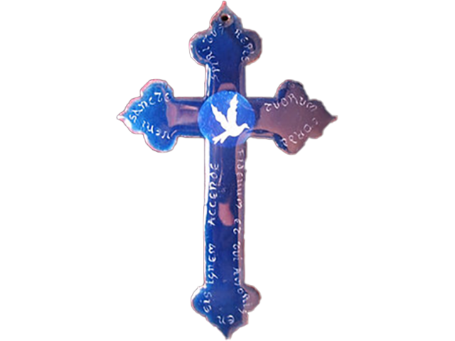 Croix orientale percée 11,5 x 7,5 cm, émail bleu 241 sur fondant 1, paillon d’argent au centre, colombe et écriture peinture à vitrifier blanche
