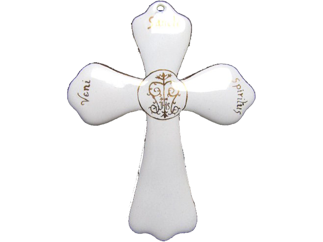 Croix simple percée 11 x 8 cm, émail blanc 160, M entouré, pourtour et inscriptions or
