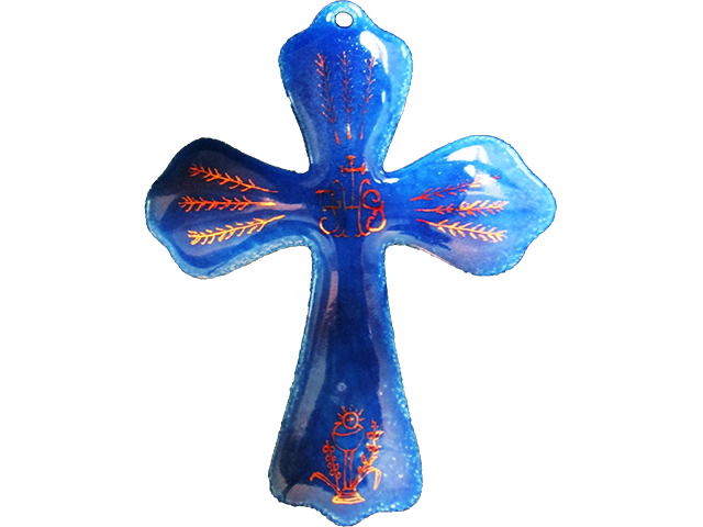 Croix simple percée 11 x 8 cm, émail bleu 25 sur blanc 160 et opale 101, épis de blé, calice et IHS or