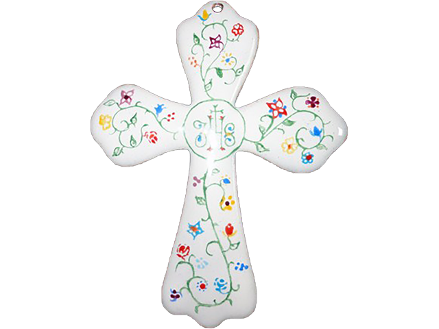 Croix simple percée 11 x 8 cm, émail blanc 160 sur fondant 1, feuillage, fleurs et IHS entouré peintures à vitrifier