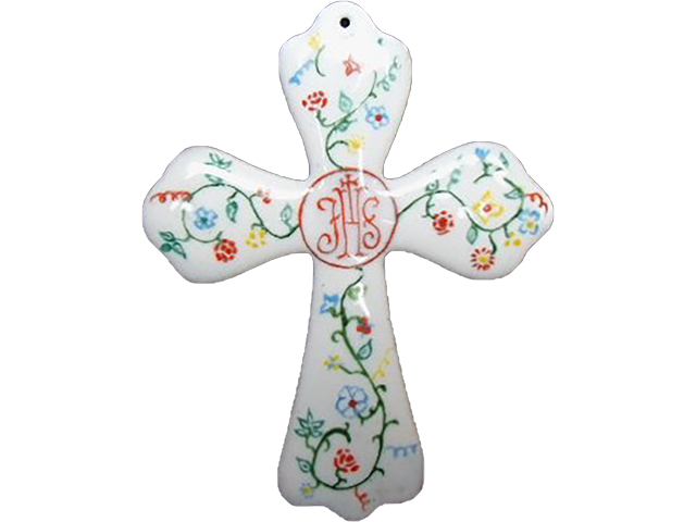 Croix simple percée 11 x 8 cm, émail blanc 160 sur fondant 1, feuillage, fleurs et IHS entouré peintures à vitrifier