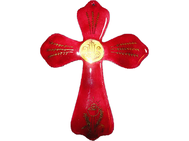 Croix simple percée 11 x 8 cm, émail rouge 40 sur blanc 160 et opale 101, centre jaune 16 sur blanc 160 et opale 101, épis de blé, calice et IHS entouré or