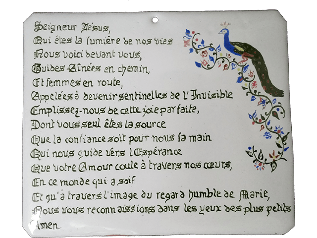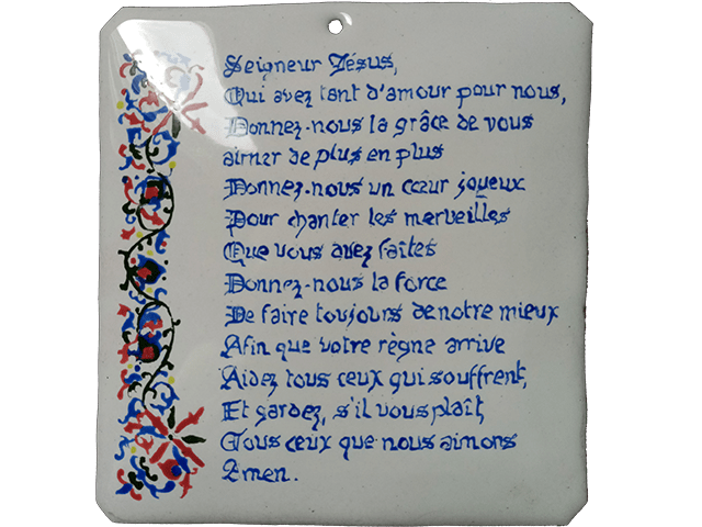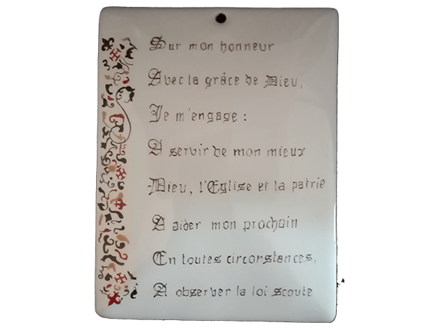 Plaques de prière ← retour Je vous salue Marie 120,00€ PLUS D’INFORMATIONS ICI Notre Père – Blanc 120,00€ PLUS D’INFORMATIONS ICI Notre Père – Blanc cassé 120,00€ PLUS D’INFORMATIONS ICI Prière des Louveteaux 120,00€ PLUS D’INFORMATIONS ICI Prière des Guides Aînées 120,00€ PLUS D’INFORMATIONS ICI Prière des Scouts Unitaires de France 120,00€ PLUS D’INFORMATIONS ICI
