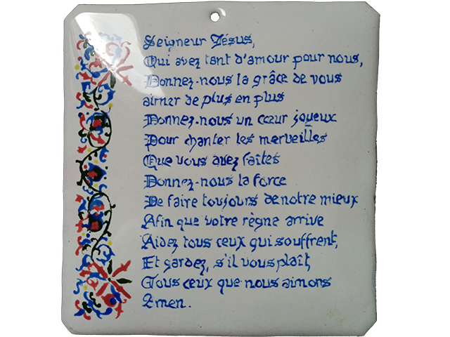 Plaque de prière émaillée percée 11 x 11 cm, émail blanc 160 sur fondant 1, fondant 2, peintures à vitrifier pour enluminures