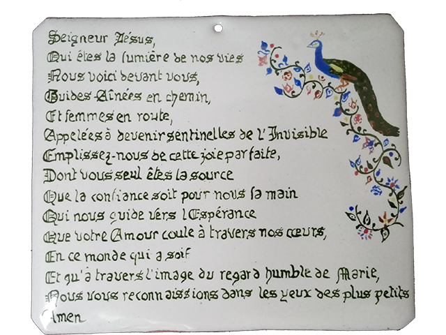 Plaque de prière émaillée percée 11 x 13 cm, émail blanc 160 sur fondant 1, fondant 2, peintures à vitrifier pour enluminures