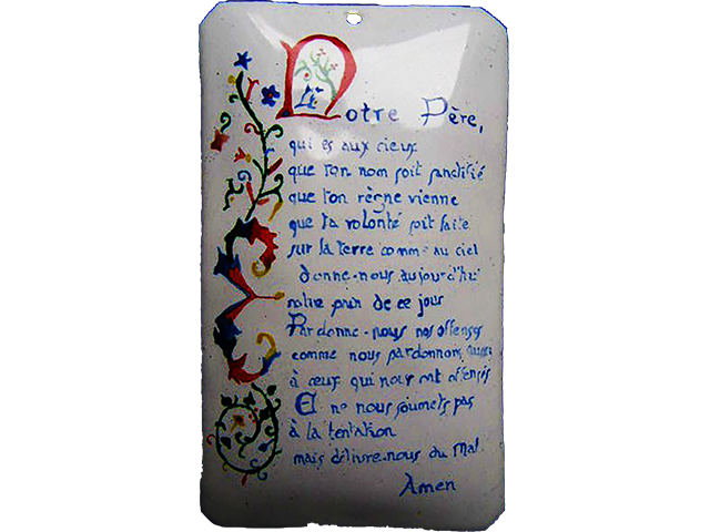 Plaque de prière émaillée percée 12 x 7 cm, émail blanc 160 sur fondant 1, fondant 2, enluminures et calligraphie peintures à vitrifier