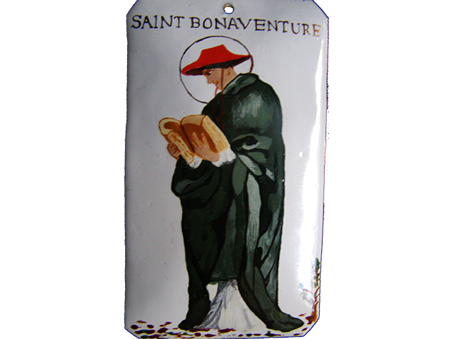 Plaque de saint patron émaillée blanche percée 12 x 7 cm, émail blanc 160 sur fondant 1, fondant 2, peintures à vitrifier, lettres et auréole or, vie du saint au dos