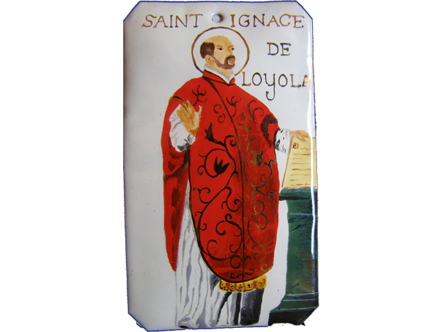 Plaque de saint patron émaillée blanche percée 12 x 7 cm, émail blanc 160 sur fondant 1, fondant 2, peintures à vitrifier, lettres et auréole or, vie du saint au dos