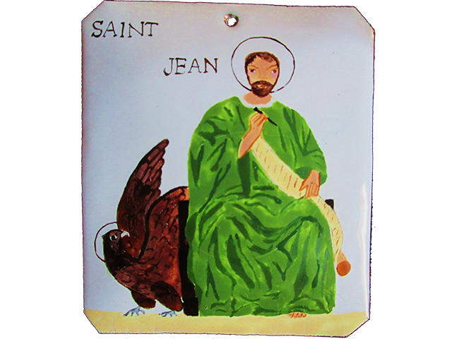 Plaque de saint patron émaillée blanche percée 12 x 7 cm, émail blanc 160 sur fondant 1, fondant 2, peintures à vitrifier, lettres et auréole or, vie du saint au dos