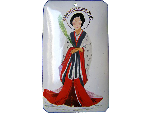 Plaque de saint patron émaillée blanche percée 12 x 7 cm, émail blanc 160 sur fondant 1, fondant 2, peintures à vitrifier, lettres et auréole or, vie du saint au dos