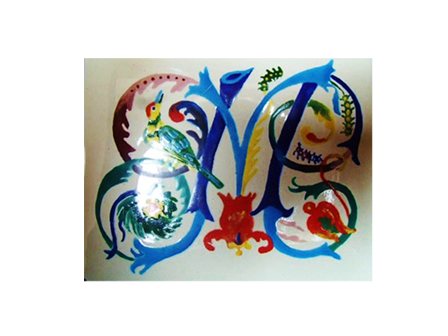 Plaque émaillée percée M enluminé 8,6 x 10,2 cm, émail opaque blanc teinté 98 sur fondant 1, fondant 2, peintures à vitrifier