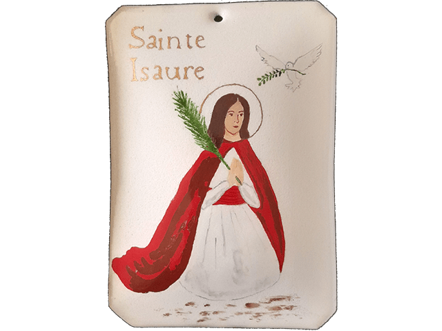 Plaque de saint patron émaillée blanche percée 12 x 7 cm, émail blanc 160 sur fondant 1, fondant 2, peintures à vitrifier, lettres et auréole or, vie du saint au dos